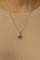 Heart of the Ocean Gold NecklaceHeart-shaped pendant with green gemstone on a gold chain against a beige fabric background